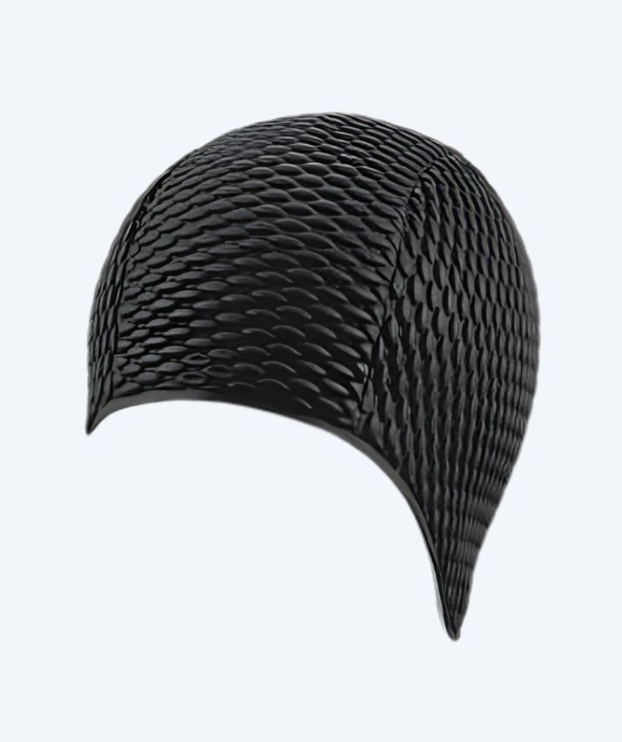 Tässä klassisessa mustassa uimalakissa on kuplamainen pinta. Sen rakenne on erilainen kuin tavallisten uimalakkien, mutta se tarjoaa silti perinteisten lakin tutut ominaisuudet.